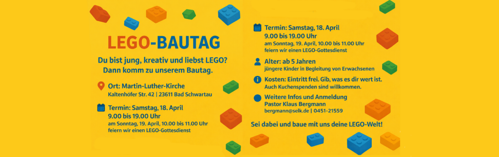 Am Samstag, 18. April 2026 (9.00 bis 19.00 Uhr), findet ein LEGO-Bautag in unserer Martin-Luther-Kirche statt.